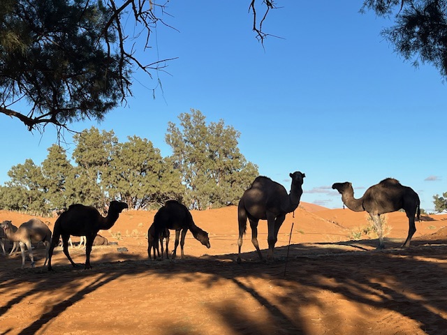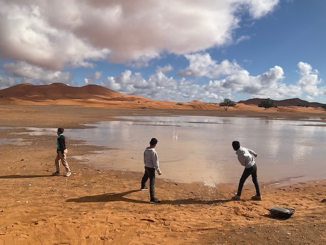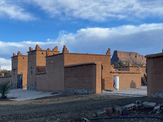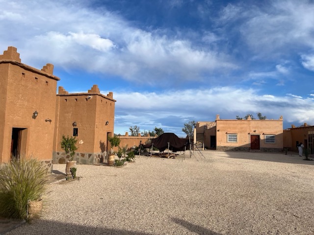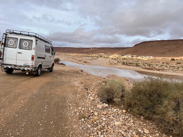 There were four other motorhomes staying, and we got to know each other over the few days. There was the older French couple I referred to in the previous post, in their 80s and quad biking, and two French ladies next to me, from whom I borrowed a ladder to try and sort my Starlink out, by resetting the router, though without success. The couple of motorhomes in the area below were both regular visitors, French and Belgian, and keen to give information on the area for hiking, though without the amount of standing water, options were limited. All of us were in the way to Merzouga, and all of us had decided to hunker down.