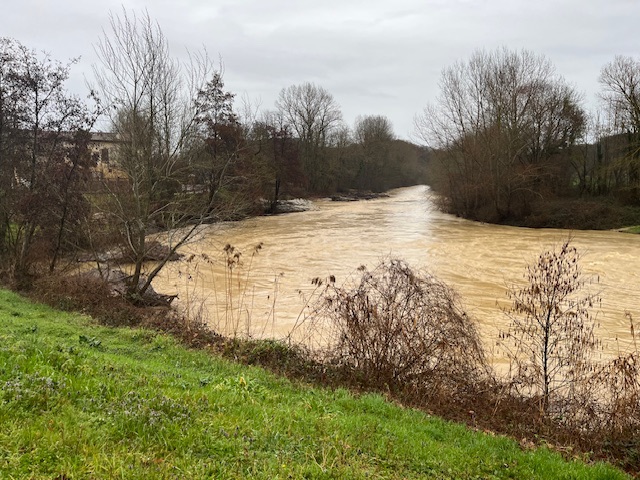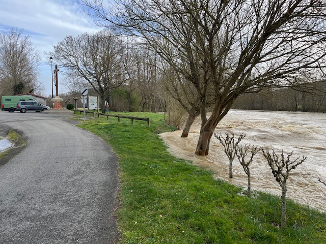 My destination was the village of Gaudiès, in the northern foothills, with Toulouse about 40 kilometres to the north. Gaudiès is on Le Grade Hers river, which in the summer is perfect for bathing, but on this day, with the snowmelt and a day of heavy rain was on severe flood alert. I parked up by the Town Hall and was settled in for the night, cooking dinner when a local knocked at țhe door. He showed me the predicted river levels on a website on his phone. Only once before, in 2020, the river had burst its banks. He showed me pictures. Though it looked very full, it didn’t seem possible it would raise another 3 metres in a few hours and threaten the village. But it was forecast to. On the guy’s suggestion, I moved fifty metres or so back, a couple of metres higher, to close to the old Chateau.
